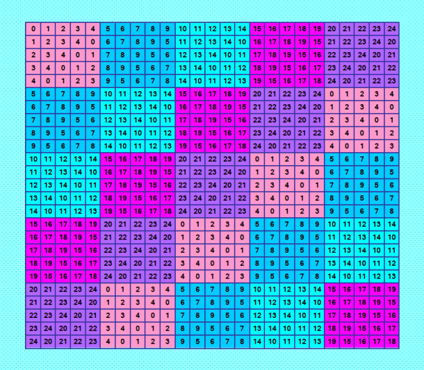 7 8 9 5 6 12 13 14 10 11 17 18 19 15 16 22 23 24 20 21 2 3 4 0 1