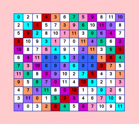 Ð’ поиÑках идеального ДЛК 12-го порÑдка... вчера взÑла Ñтого монÑтра 0 10 4 6 2 8 9 3 7 5 11 1 11 1 7 5 9 3 2 8 4 6 0 10 4 6 2 8 1 11 10 0 9 3 7 5 7 5 9 3 10 0 1 11 2 8 4 6 3 9 0 10 4 6 7 5 11 1 8 2 8 2 11 1 7 5 4 6 0 10 3 9 2 8 1 11 5 7 6 4 10 0 9 3 9 3 10 0 6 4 5 7 1 11 2 8 5 7 3 9 0 10 11 1 8 2 6 4 6 4 8 2 11 1 0 10 3 9 5 7 1 11 5 7 3 9 8 2 6 4 10 0 10 0 6 4 8 2 3 9 5 7 1 11 иллюÑÑ‚Ñ€Ð°Ñ†Ð¸Ñ Ðтот ДЛК имеет макÑимальное на данный момент количеÑтво Д-транÑверÑалей: 28496. Проверка ÑвойÑтв утилитой Harry White Order? 12