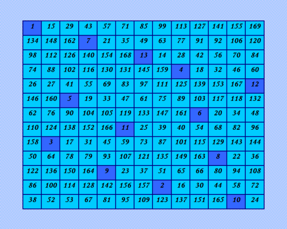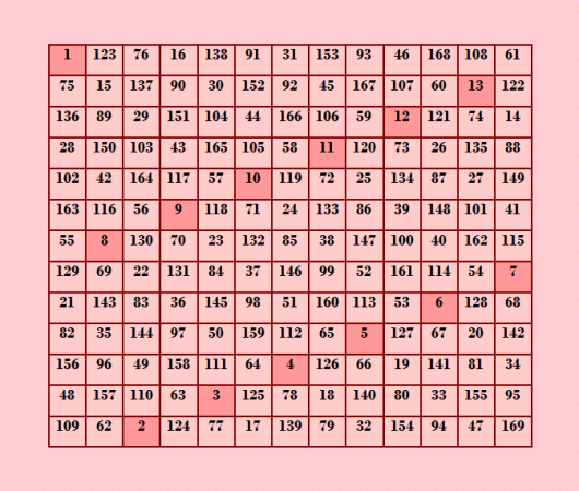 Ð¥Ð¾Ñ‚Ñ Ð¿Ð¾Ñтроение пандиагональных магичеÑких квадратов 13-го порÑдка не ÑвлÑетÑÑ Ð¿Ñ€Ð¾Ð±Ð»ÐµÐ¼Ð¾Ð¹, покажу вÑÑ‘-таки принципиально новый пандиагональный магичеÑкий квадрат, поÑтроенный Ñ Ð¿Ð¾Ð¼Ð¾Ñ‰ÑŒÑŽ показанной выше ортогональной пары полуцикличеÑких пандиагональных ДЛК методом латинÑких квадратов Обратите внимание на начальную цепочку магичеÑкого квадрата, она выделена более тёмным цветом. |