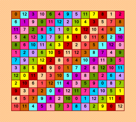 ПредÑтавлÑÑŽ 26 идеальных ДЛК 13-го порÑдка, которые ÑвлÑÑŽÑ‚ÑÑ Ð¿Ð¾Ð»ÑƒÑ†Ð¸ÐºÐ»Ð¸Ñ‡ÐµÑкими пандиагональными (Ñ Ñ†Ð¸ÐºÐ»Ð¸Ñ‡Ð½Ð¾Ñтью в Ñтроках) 0 8 7 11 6 1 5 4 12 10 3 9 2 6 1 5 4 12 10 3 9 2 0 8 7 11 3 9 2 0 8 7 11 6 1 5 4 12 10 4 12 10 3 9 2 0 8 7 11 6 1 5 11 6 1 5 4 12 10 3 9 2 0 8 7 8 7 11 6 1 5 4 12 10 3 9 2 0 9 2 0 8 7 11 6 1 5 4 12 10 3 12 10 3 9 2 0 8 7 11 6 1 5 4 5 4 12 10 3 9 2 0 8 7 11 6 1 7 11 6 1 5 4 12 10 3 9 2 0 8 2 0 8 7 11 6 1 5 4 12 10 3 9 1 5 4 12 10 3 9 2 0 8 7 11 6 10 3 9 2 0 8 7 11 6 1 5 4 12 0 4 10 9 6 3 2 8 12 1 7 5 11 12 1 7 5 11 0 4 10 9 6 3 2 8 6 3 2 8 12 1 7 5 11 0 4 10 9 10 9 6 3 2 8 12 1 7 5 11 0 4 7 5 11 0 4 10 9 6 3 2 8 12 1 2 8 12 1 7 5 11 0 4 10 9 6 3 5 11 0 4 10 9 6 3 2 8 12 1 7 9 6 3 2 8 12 1 7 5 11 0 4 10 11 0 4 10 9 6 3 2 8 12 1 7 5 8 12 1 7 5 11 0 4 10 9 6 3 2 3 2 8 12 1 7 5 11 0 4 10 9 6 4 10 9 6 3 2 8 12 1 7 5 11 0 1 7 5 11 0 4 10 9 6 3 2 8 12 0 10 6 2 12 11 9 8 5 7 4 3 1 3 1 0 10 6 2 12 11 9 8 5 7 4 10 6 2 12 11 9 8 5 7 4 3 1 0 5 7 4 3 1 0 10 6 2 12 11 9 8 9 8 5 7 4 3 1 0 10 6 2 12 11 2 12 11 9 8 5 7 4 3 1 0 10 6 7 4 3 1 0 10 6 2 12 11 9 8 5 6 2 12 11 9 8 5 7 4 3 1 0 10 1 0 10 6 2 12 11 9 8 5 7 4 3 4 3 1 0 10 6 2 12 11 9 8 5 7 12 11 9 8 5 7 4 3 1 0 10 6 2 8 5 7 4 3 1 0 10 6 2 12 11 9 11 9 8 5 7 4 3 1 0 10 6 2 12 0 2 6 10 12 7 4 3 11 1 9 8 5 11 1 9 8 5 0 2 6 10 12 7 4 3 5 0 2 6 10 12 7 4 3 11 1 9 8 12 7 4 3 11 1 9 8 5 0 2 6 10 6 10 12 7 4 3 11 1 9 8 5 0 2 3 11 1 9 8 5 0 2 6 10 12 7 4 1 9 8 5 0 2 6 10 12 7 4 3 11 8 5 0 2 6 10 12 7 4 3 11 1 9 10 12 7 4 3 11 1 9 8 5 0 2 6 2 6 10 12 7 4 3 11 1 9 8 5 0 4 3 11 1 9 8 5 0 2 6 10 12 7 9 8 5 0 2 6 10 12 7 4 3 11 1 7 4 3 11 1 9 8 5 0 2 6 10 12 0 8 6 4 12 2 5 9 11 1 3 7 10 11 1 3 7 10 0 8 6 4 12 2 5 9 4 12 2 5 9 11 1 3 7 10 0 8 6 9 11 1 3 7 10 0 8 6 4 12 2 5 10 0 8 6 4 12 2 5 9 11 1 3 7 8 6 4 12 2 5 9 11 1 3 7 10 0 1 3 7 10 0 8 6 4 12 2 5 9 11 12 2 5 9 11 1 3 7 10 0 8 6 4 5 9 11 1 3 7 10 0 8 6 4 12 2 7 10 0 8 6 4 12 2 5 9 11 1 3 6 4 12 2 5 9 11 1 3 7 10 0 8 3 7 10 0 8 6 4 12 2 5 9 11 1 2 5 9 11 1 3 7 10 0 8 6 4 12 0 3 6 9 12 2 11 8 7 5 4 1 10 4 1 10 0 3 6 9 12 2 11 8 7 5 9 12 2 11 8 7 5 4 1 10 0 3 6 1 10 0 3 6 9 12 2 11 8 7 5 4 11 8 7 5 4 1 10 0 3 6 9 12 2 12 2 11 8 7 5 4 1 10 0 3 6 9 5 4 1 10 0 3 6 9 12 2 11 8 7 3 6 9 12 2 11 8 7 5 4 1 10 0 10 0 3 6 9 12 2 11 8 7 5 4 1 8 7 5 4 1 10 0 3 6 9 12 2 11 6 9 12 2 11 8 7 5 4 1 10 0 3 7 5 4 1 10 0 3 6 9 12 2 11 8 2 11 8 7 5 4 1 10 0 3 6 9 12 0 8 6 4 12 2 11 9 7 5 3 1 10 3 1 10 0 8 6 4 12 2 11 9 7 5 4 12 2 11 9 7 5 3 1 10 0 8 6 9 7 5 3 1 10 0 8 6 4 12 2 11 10 0 8 6 4 12 2 11 9 7 5 3 1 12 2 11 9 7 5 3 1 10 0 8 6 4 5 3 1 10 0 8 6 4 12 2 11 9 7 8 6 4 12 2 11 9 7 5 3 1 10 0 11 9 7 5 3 1 10 0 8 6 4 12 2 1 10 0 8 6 4 12 2 11 9 7 5 3 6 4 12 2 11 9 7 5 3 1 10 0 8 7 5 3 1 10 0 8 6 4 12 2 11 9 2 11 9 7 5 3 1 10 0 8 6 4 12 0 3 11 7 10 2 5 1 9 12 8 6 4 5 1 9 12 8 6 4 0 3 11 7 10 2 7 10 2 5 1 9 12 8 6 4 0 3 11 6 4 0 3 11 7 10 2 5 1 9 12 8 9 12 8 6 4 0 3 11 7 10 2 5 1 3 11 7 10 2 5 1 9 12 8 6 4 0 2 5 1 9 12 8 6 4 0 3 11 7 10 12 8 6 4 0 3 11 7 10 2 5 1 9 11 7 10 2 5 1 9 12 8 6 4 0 3 4 0 3 11 7 10 2 5 1 9 12 8 6 1 9 12 8 6 4 0 3 11 7 10 2 5 10 2 5 1 9 12 8 6 4 0 3 11 7 8 6 4 0 3 11 7 10 2 5 1 9 12 0 5 9 4 1 11 8 3 7 12 2 6 10 4 1 11 8 3 7 12 2 6 10 0 5 9 7 12 2 6 10 0 5 9 4 1 11 8 3 1 11 8 3 7 12 2 6 10 0 5 9 4 10 0 5 9 4 1 11 8 3 7 12 2 6 12 2 6 10 0 5 9 4 1 11 8 3 7 11 8 3 7 12 2 6 10 0 5 9 4 1 5 9 4 1 11 8 3 7 12 2 6 10 0 6 10 0 5 9 4 1 11 8 3 7 12 2 8 3 7 12 2 6 10 0 5 9 4 1 11 9 4 1 11 8 3 7 12 2 6 10 0 5 3 7 12 2 6 10 0 5 9 4 1 11 8 2 6 10 0 5 9 4 1 11 8 3 7 12 0 3 5 7 9 12 4 2 1 6 11 10 8 2 1 6 11 10 8 0 3 5 7 9 12 4 12 4 2 1 6 11 10 8 0 3 5 7 9 10 8 0 3 5 7 9 12 4 2 1 6 11 5 7 9 12 4 2 1 6 11 10 8 0 3 11 10 8 0 3 5 7 9 12 4 2 1 6 7 9 12 4 2 1 6 11 10 8 0 3 5 6 11 10 8 0 3 5 7 9 12 4 2 1 9 12 4 2 1 6 11 10 8 0 3 5 7 1 6 11 10 8 0 3 5 7 9 12 4 2 3 5 7 9 12 4 2 1 6 11 10 8 0 8 0 3 5 7 9 12 4 2 1 6 11 10 4 2 1 6 11 10 8 0 3 5 7 9 12 0 9 7 5 3 12 2 8 11 6 1 4 10 6 1 4 10 0 9 7 5 3 12 2 8 11 3 12 2 8 11 6 1 4 10 0 9 7 5 9 7 5 3 12 2 8 11 6 1 4 10 0 8 11 6 1 4 10 0 9 7 5 3 12 2 4 10 0 9 7 5 3 12 2 8 11 6 1 5 3 12 2 8 11 6 1 4 10 0 9 7 11 6 1 4 10 0 9 7 5 3 12 2 8 10 0 9 7 5 3 12 2 8 11 6 1 4 12 2 8 11 6 1 4 10 0 9 7 5 3 7 5 3 12 2 8 11 6 1 4 10 0 9 1 4 10 0 9 7 5 3 12 2 8 11 6 2 8 11 6 1 4 10 0 9 7 5 3 12 0 12 3 5 8 10 1 6 11 2 4 7 9 10 1 6 11 2 4 7 9 0 12 3 5 8 6 11 2 4 7 9 0 12 3 5 8 10 1 9 0 12 3 5 8 10 1 6 11 2 4 7 1 6 11 2 4 7 9 0 12 3 5 8 10 7 9 0 12 3 5 8 10 1 6 11 2 4 12 3 5 8 10 1 6 11 2 4 7 9 0 8 10 1 6 11 2 4 7 9 0 12 3 5 2 4 7 9 0 12 3 5 8 10 1 6 11 5 8 10 1 6 11 2 4 7 9 0 12 3 11 2 4 7 9 0 12 3 5 8 10 1 6 4 7 9 0 12 3 5 8 10 1 6 11 2 3 5 8 10 1 6 11 2 4 7 9 0 12 0 12 11 9 5 8 10 6 2 4 7 3 1 3 1 0 12 11 9 5 8 10 6 2 4 7 10 6 2 4 7 3 1 0 12 11 9 5 8 2 4 7 3 1 0 12 11 9 5 8 10 6 8 10 6 2 4 7 3 1 0 12 11 9 5 1 0 12 11 9 5 8 10 6 2 4 7 3 12 11 9 5 8 10 6 2 4 7 3 1 0 9 5 8 10 6 2 4 7 3 1 0 12 11 7 3 1 0 12 11 9 5 8 10 6 2 4 6 2 4 7 3 1 0 12 11 9 5 8 10 4 7 3 1 0 12 11 9 5 8 10 6 2 5 8 10 6 2 4 7 3 1 0 12 11 9 11 9 5 8 10 6 2 4 7 3 1 0 12 0 10 9 1 7 6 5 11 3 2 12 8 4 9 1 7 6 5 11 3 2 12 8 4 0 10 11 3 2 12 8 4 0 10 9 1 7 6 5 6 5 11 3 2 12 8 4 0 10 9 1 7 3 2 12 8 4 0 10 9 1 7 6 5 11 10 9 1 7 6 5 11 3 2 12 8 4 0 4 0 10 9 1 7 6 5 11 3 2 12 8 12 8 4 0 10 9 1 7 6 5 11 3 2 1 7 6 5 11 3 2 12 8 4 0 10 9 5 11 3 2 12 8 4 0 10 9 1 7 6 7 6 5 11 3 2 12 8 4 0 10 9 1 2 12 8 4 0 10 9 1 7 6 5 11 3 8 4 0 10 9 1 7 6 5 11 3 2 12 0 11 10 7 3 6 9 5 2 1 12 4 8 2 1 12 4 8 0 11 10 7 3 6 9 5 9 5 2 1 12 4 8 0 11 10 7 3 6 11 10 7 3 6 9 5 2 1 12 4 8 0 5 2 1 12 4 8 0 11 10 7 3 6 9 10 7 3 6 9 5 2 1 12 4 8 0 11 8 0 11 10 7 3 6 9 5 2 1 12 4 1 12 4 8 0 11 10 7 3 6 9 5 2 3 6 9 5 2 1 12 4 8 0 11 10 7 12 4 8 0 11 10 7 3 6 9 5 2 1 6 9 5 2 1 12 4 8 0 11 10 7 3 7 3 6 9 5 2 1 12 4 8 0 11 10 4 8 0 11 10 7 3 6 9 5 2 1 12 0 11 3 6 9 1 12 5 10 8 4 2 7 9 1 12 5 10 8 4 2 7 0 11 3 6 8 4 2 7 0 11 3 6