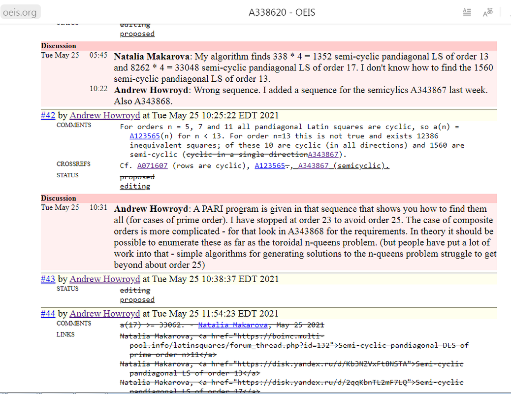 ПопыталаÑÑŒ внеÑти полученные результаты Ð´Ð»Ñ Ð¿Ð¾Ñ€Ñдков 13 и 17 в OEIS https://oeis.org/draft/A338620 Показываю Ñкриншот Очень удивил комментарий редактора Andrew Howroyd: Wrong sequence. I added a sequence for the semicylics A343867 last week. Also A343868. Как-то не очень понÑтно. Что значит: "Wrong sequence."? ЕÑли Ð½ÐµÐ¿Ñ€Ð°Ð²Ð¸Ð»ÑŒÐ½Ð°Ñ - иÑправьте! Ðу да ладно. ЕÑли поÑледовательноÑть неправильнаÑ, то добавлÑть в неё ничего не надо. И поÑтому, видимо, вÑÑ Ð¼Ð¾Ñ Ð¿Ñ€Ð°Ð²ÐºÐ° летит в топку. Ð’Ñтупать в диÑкуÑÑию не буду. Ðто беÑÑмыÑленно. Редактор вÑегда прав! |