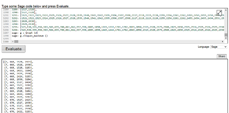 Цитата Цитата Ð¡ÐµÐ³Ð¾Ð´Ð½Ñ Ð¿Ñ€Ð¸ÑˆÐ»Ð° в голову мыÑль, что Ñ Ð½Ðµ проверила Ñту офигенную группу ОДЛК на макÑимальную клику. ВзÑла таблицу ортогональных пар и ввела её в программу SageMath. Программа выдала клики размера 4. Супер! Выше была получена клика размера 6 Ð´Ð»Ñ Ð¿Ð¾Ñ€Ñдка 72. ЗдеÑÑŒ поменьше клика получилаÑÑŒ, но вÑÑ‘ равно интереÑно. КÑтати, а ÐºÐ°ÐºÐ°Ñ Ð³Ñ€ÑƒÐ¿Ð¿Ð° MOLS 72-го порÑдка извеÑтна на данный момент математикам? Ð¡ÐµÐ¹Ñ‡Ð°Ñ Ñпрошу у программы SageMath. |