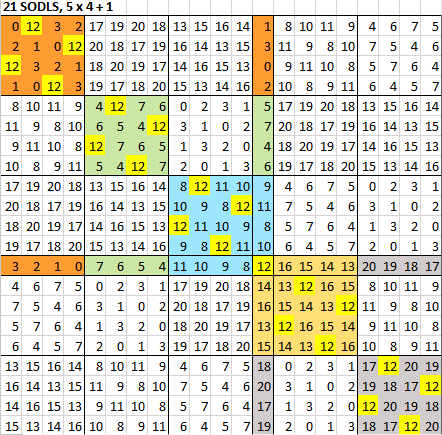 Решила попробовать ДЛК из другой Ñерии порÑдков. У Ð¼ÐµÐ½Ñ Ð½ÐµÑ‚ ничего кроме однушек Ð´Ð»Ñ Ð¿Ð¾Ñ€Ñдка 21. У Harry на Ñайте (ÑÑылка дана в Ñтартовом поÑте) нашла такой Ñимпатичный квадратик 21-го порÑдка Ðто тоже SODLS. Показываю Ñтот ДЛК в обычном формате 0 12 3 2 17 19 20 18 13 15 16 14 1 8 10 11 9 4 6 7 5 2 1 0 12 20 18 17 19 16 14 13 15 3 11 9 8 10 7 5 4 6 12 3 2 1 18 20 19 17 14 16 15 13 0 9 11 10 8 5 7 6 4 1 0 12 3 19 17 18 20 15 13 14 16 2 10 8 9 11 6 4 5 7 8 10 11 9 4 12 7 6 0 2 3 1 5 17 19 20 18 13 15 16 14 11 9 8 10 6 5 4 12 3 1 0 2 7 20 18 17 19 16 14 13 15 9 11 10 8 12 7 6 5 1 3 2 0 4 18 20 19 17 14 16 15 13 10 8 9 11 5 4 12 7 2 0 1 3 6 19 17 18 20 15 13 14 16 17 19 20 18 13 15 16 14 8 12 11 10 9 4 6 7 5 0 2 3 1 20 18 17 19 16 14 13 15 10 9 8 12 11 7 5 4 6 3 1 0 2 18 20 19 17 14 16 15 13 12 11 10 9 8 5 7 6 4 1 3 2 0 19 17 18 20 15 13 14 16 9 8 12 11 10 6 4 5 7 2 0 1 3 3 2 1 0 7 6 5 4 11 10 9 8 12 16 15 14 13 20 19 18 17 4 6 7 5 0 2 3 1 17 19 20 18 14 13 12 16 15 8 10 11 9 7 5 4 6 3 1 0 2 20 18 17 19 16 15 14 13 12 11 9 8 10 5 7 6 4 1 3 2 0 18 20 19 17 13 12 16 15 14 9 11 10 8 6 4 5 7 2 0 1 3 19 17 18 20 15 14 13 12 16 10 8 9 11 13 15 16 14 8 10 11 9 4 6 7 5 18 0 2 3 1 17 12 20 19 16 14 13 15 11 9 8 10 7 5 4 6 20 3 1 0 2 19 18 17 12 14 16 15 13 9 11 10 8 5 7 6 4 17 1 3 2 0 12 20 19 18 15 13 14 16 10 8 9 11 6 4 5 7 19 2 0 1 3 18 17 12 20 Ðлгоритм тот же Ñамый. Беру транÑпонированный вариант Ñтого ДЛК, немного изменÑÑŽ четыре подквадрата 4Ñ…4 и дальше вÑÑ‘, как в предыдущем алгоритме Ð´Ð»Ñ Ð¿Ð¾Ñ€Ñдков Ñерии n=4k+2. И вот она - Ð¿ÐµÑ€Ð²Ð°Ñ Ð´Ð²ÑƒÑˆÐµÑ‡ÐºÐ° 21-го порÑдка DLK 0 1 2 3 4 5 6 7 8 9 10 11 12 13 14 15 16 17 18 19 20 3 12 0 1 6 7 4 5 10 11 8 9 2 15 16 13 14 19 20 17 18 1 2 3 12 7 6 5 4 11 10 9 8 0 16 15 14 13 20 19 18 17 12 0 1 2 5 4 7 6 9 8 11 10 3 14 13 16 15 18 17 20 19 13 14 15 16 17 1 19 18 0 3 2 12 20 4 5 6 7 8 9 10 11 15 16 13 14 18 20 17 1 2 12 0 3 19 6 7 4 5 10 11 8 9 16 15 14 13 1 19 18 20 12 2 3 0 17 7 6 5 4 11 10 9 8 14 13 16 15 20 17 1 19 3 0 12 2 18 5 4 7 6 9 8 11 10 4 5 6 7 8 9 10 11 13 1 15 14 16 17 18 19 20 0 3 2 12 6 7 4 5 10 11 8 9 14 16 13 1 15 19 20 17 18 2 12 0 3 7 6 5 4 11 10 9 8 1 15 14 16 13 20 19 18 17 12 2 3 0 5 4 7 6 9 8 11 10 16 13 1 15 14 18 17 20 19 3 0 12 2 2 3 12 0 19 18 20 17 15 14 16 13 1 10 9 11 8 6 5 7 4 17 18 19 20 0 3 2 12 4 5 6 7 11 8 1 10 9 13 14 15 16 19 20 17 18 2 12 0 3 6 7 4 5 10 9 11 8 1 15 16 13 14 20 19 18 17 12 2 3 0 7 6 5 4 8 1 10 9 11 16 15 14 13 18 17 20 19 3 0 12 2 5 4 7 6 9 11 8 1 10 14 13 16 15 8 9 10 11 13 14 15 16 17 18 19 20 7 0 3 2 12 4 1 6 5 10 11 8 9 15 16 13 14 19 20 17 18 6 2 12 0 3 5 7 4 1 11 10 9 8 16 15 14 13 20 19 18 17 4 12 2 3 0 1 6 5 7 9 8 11 10 14 13 16 15 18 17 20 19 5 3 0 12 2 7 4 1 6 mate #1 0 1 2 3 4 5 6 7 8 9 10 11 12 13 14 15 16 17 18 19 20 2 3 12 0 7 6 5 4 11 10 9 8 1 16 15 14 13 20 19 18 17 12 0 1 2 5 4 7 6 9 8 11 10 3 14 13 16 15 18 17 20 19 1 2 3 12 6 7 4 5 10 11 8 9 0 15 16 13 14 19 20 17 18 8 9 10 11 13 16 2 15 17 18 19 20 14 0 12 3 1 4 5 6 7 11 10 9 8 2 15 14 13 20 19 18 17 16 1 3 12 0 7 6 5 4 9 8 11 10 14 13 16 2 18 17 20 19 15 12 0 1 3 5 4 7 6 10 11 8 9 16 2 15 14 19 20 17 18 13 3 1 0 12 6 7 4 5 17 18 19 20 0 12 3 1 4 7 2 6 5 8 9 10 11 13 14 15 16 20 19 18 17 1 3 12 0 2 6 5 4 7 11 10 9 8 16 15 14 13 18 17 20 19 12 0 1 3 5 4 7 2 6 9 8 11 10 14 13 16 15 19 20 17 18 3 1 0 12 7 2 6 5 4 10 11 8 9 15 16 13 14 3 12 0 1 15 14 13 16 6 5 4 7 2 19 18 17 20 10 9 8 11 4 5 6 7 8 9 10 11 13 14 15 16 18 17 20 2 19 0 12 3 1 7 6 5 4 11 10 9 8 16 15 14 13 20 2 19 18 17 1 3 12 0 5 4 7 6 9 8 11 10 14 13 16 15 19 18 17 20 2 12 0 1 3 6 7 4 5 10 11 8 9 15 16 13 14 17 20 2 19 18 3 1 0 12 13 14 15 16 17 18 19 20 0 12 3 1 9 4 5 6 7 8 11 2 10 16 15 14 13 20 19 18 17 1 3 12 0 11 7 6 5 4 2 10 9 8 14 13 16 15 18 17 20 19 12 0 1 3 10 5 4 7 6 9 8 11 2 15 16 13 14 19 20 17 18 3 1 0 12 8 6 7 4 5 11 2 10 9 mate #2 0 1 2 3 4 5 6 7 8 9 10 11 12 13 14 15 16 17 18 19 20 2 3 12 0 7 6 5 4 11 10 9 8 1 16 15 14 13 20 19 18 17 12 0 1 2 5 4 7 6 9 8 11 10 3 14 13 16 15 18 17 20 19 1 2 3 12 6 7 4 5 10 11 8 9 0 15 16 13 14 19 20 17 18 8 9 10 11 13 16 2 15 17 18 19 20 14 0 12 1 3 4 5 6 7 11 10 9 8 2 15 14 13 20 19 18 17 16 3 1 12 0 7 6 5 4 9 8 11 10 14 13 16 2 18 17 20 19 15 12 0 3 1 5 4 7 6 10 11 8 9 16 2 15 14 19 20 17 18 13 1 3 0 12 6 7 4 5 17 18 19 20 0 12 1 3 4 7 2 6 5 8 9 10 11 13 14 15 16 20 19 18 17 3 1 12 0 2 6 5 4 7 11 10 9 8 16 15 14 13 18 17 20 19 12 0 3 1 5 4 7 2 6 9 8 11 10 14 13 16 15 19 20 17 18 1 3 0 12 7 2 6 5 4 10 11 8 9 15 16 13 14 3 12 0 1 15 14 13 16 6 5 4 7 2 19 18 17 20 10 9 8 11 4 5 6 7 8 9 10 11 13 14 15 16 18 17 20 2 19 0 12 1 3 7 6 5 4 11 10 9 8 16 15 14 13 20 2 19 18 17 3 1 12 0 5 4 7 6 9 8 11 10 14 13 16 15 19 18 17 20 2 12 0 3 1 6 7 4 5 10 11 8 9 15 16 13 14 17 20 2 19 18 1 3 0 12 13 14 15 16 17 18 19 20 0 12 1 3 9 4 5 6 7 8 11 2 10 16 15 14 13 20 19 18 17 3 1 12 0 11 7 6 5 4 2 10 9 8 14 13 16 15 18 17 20 19 12 0 3 1 10 5 4 7 6 9 8 11 2 15 16 13 14 19 20 17 18 1 3 0 12 8 6 7 4 5 11 2 10 9 И результат Ð´Ð»Ñ Ð¿Ð¾Ñ€Ñдка 21 пока улучшен немножко a(21) >= 2. Думаю, что можно и ещё улучшить, но нужна помощь Harry в преобразовании транÑпонированного варианта. Вручную Ñто очень долго делать. |