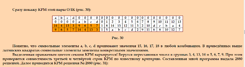 Ð’ моей Ñтатье, на которую ÑÑылаетÑÑ Harry http://www.natalimak1.narod.ru/diagon.htm приведена квази-разноÑÑ‚Ð½Ð°Ñ Ð¼Ð°Ñ‚Ñ€Ð¸Ñ†Ð° (Ñм. риÑ. 30), по которой ÑтроÑÑ‚ÑÑ Ð»Ð°Ñ‚Ð¸Ð½Ñкие квадраты 18-го порÑдка, показанные на риÑ. 28 – 29. Harry пишет I couldn’t understand figures 30 and 31 or how the Latin squares were derived from them, Попробую объÑÑнить Ñначала, как по квази-разноÑтной матрице (далее – КРМ) ÑтроÑÑ‚ÑÑ Ð»Ð°Ñ‚Ð¸Ð½Ñкие квадрататы. Смотрим на КРМ По поводу Ñимвольных переменных a, b, c, d напиÑано поÑÑнение. Ð’ КРМ видим четыре Ñтроки. Первому латинÑкому квадрату ÑоответÑтвует Ñ‚Ñ€ÐµÑ‚ÑŒÑ Ñтрока, второму латинÑкому квадрату – Ñ‡ÐµÑ‚Ð²Ñ‘Ñ€Ñ‚Ð°Ñ Ñтрока (ÑÑ‡Ð¸Ñ‚Ð°Ñ Ñверху). ПожалуйÑта, поÑмотрите теперь на КРМ и на ÑоответÑтвующие ей латинÑкие квадраты (риÑ. 28 - 29). ГоÑпода! ЕÑли вы не понимаете, как ÑтроÑÑ‚ÑÑ Ñти латинÑкие квадраты по КРМ, Ñообщите, пожалуйÑта. Я раÑÑкажу более подробно. О варьировании КРМ раÑÑкажу далее. |