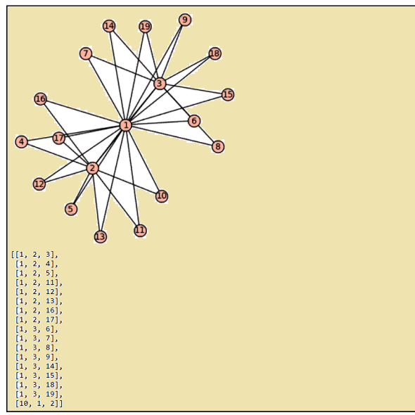 Вчера иÑкала в новом графе (Ñм. предыдущий поÑÑ‚) клики вручную. Ох! Хорошо, что было не очень жарко поÑле дождичка, а то точно крыша Ñъехала бы :) ÐÑ…, жиÑть ÐºÐ°ÐºÐ°Ñ Ð¿Ð»Ð¾Ñ…Ð°Ñ: еÑть же программа Ð´Ð»Ñ Ð¿Ð¾Ð¸Ñка макÑимальных клик, но она почему-то не желает обÑчитывать большие графы. Ðто недоработка программы, на мой взглÑд. Ðу вот, нашла ПОЧТИ клику размера 4. Ðо ПОЧТИ, как извеÑтно, не ÑчитаетÑÑ. Ð’ÑÑ‘ равно покажу Ñту клику квадрат 1 - ЛК 0 1 2 3 4 5 6 7 8 9 10 11 12 13 14 15 16 17 18 19 4 0 1 2 3 9 5 6 7 8 14 10 11 12 13 19 15 16 17 18 3 4 0 1 2 8 9 5 6 7 13 14 10 11 12 18 19 15 16 17 2 3 4 0 1 7 8 9 5 6 12 13 14 10 11 17 18 19 15 16 1 2 3 4 0 6 7 8 9 5 11 12 13 14 10 16 17 18 19 15 5 6 7 8 9 0 1 2 3 4 15 16 17 18 19 10 11 12 13 14 9 5 6 7 8 4 0 1 2 3 19 15 16 17 18 14 10 11 12 13 8 9 5 6 7 3 4 0 1 2 18 19 15 16 17 13 14 10 11 12 7 8 9 5 6 2 3 4 0 1 17 18 19 15 16 12 13 14 10 11 6 7 8 9 5 1 2 3 4 0 16 17 18 19 15 11 12 13 14 10 10 11 12 13 14 15 16 17 18 19 0 1 2 3 4 5 6 7 8 9 14 10 11 12 13 19 15 16 17 18 4 0 1 2 3 9 5 6 7 8 13 14 10 11 12 18 19 15 16 17 3 4 0 1 2 8 9 5 6 7 12 13 14 10 11 17 18 19 15 16 2 3 4 0 1 7 8 9 5 6 11 12 13 14 10 16 17 18 19 15 1 2 3 4 0 6 7 8 9 5 15 16 17 18 19 10 11 12 13 14 5 6 7 8 9 0 1 2 3 4 19 15 16 17 18 14 10 11 12 13 9 5 6 7 8 4 0 1 2 3 18 19 15 16 17 13 14 10 11 12 8 9 5 6 7 3 4 0 1 2 17 18 19 15 16 12 13 14 10 11 7 8 9 5 6 2 3 4 0 1 16 17 18 19 15 11 12 13 14 10 6 7 8 9 5 1 2 3 4 0 квадрат 2 - ДЛК 0 1 2 3 4 5 6 7 8 9 10 11 12 13 14 15 16 17 18 19 9 5 6 7 8 4 0 1 2 3 19 15 16 17 18 14 10 11 12 13 7 8 9 5 6 2 3 4 0 1 17 18 19 15 16 12 13 14 10 11 12 13 14 10 11 17 18 19 15 16 2 3 4 0 1 7 8 9 5 6 16 17 18 19 15 11 12 13 14 10 6 7 8 9 5 1 2 3 4 0 18 19 15 16 17 13 14 10 11 12 8 9 5 6 7 3 4 0 1 2 10 11 12 13 14 15 16 17 18 19 0 1 2 3 4 5 6 7 8 9 19 15 16 17 18 14 10 11 12 13 9 5 6 7 8 4 0 1 2 3 6 7 8 9 5 1 2 3 4 0 16 17 18 19 15 11 12 13 14 10 3 4 0 1 2 8 9 5 6 7 13 14 10 11 12 18 19 15 16 17 8 9 5 6 7 3 4 0 1 2 18 19 15 16 17 13 14 10 11 12 1 2 3 4 0 6 7 8 9 5 11 12 13 14 10 16 17 18 19 15 14 10 11 12 13 19 15 16 17 18 4 0 1 2 3 9 5 6 7 8 15 16 17 18 19 10 11 12 13 14 5 6 7 8 9 0 1 2 3 4 13 14 10 11 12 18 19 15 16 17 3 4 0 1 2 8 9 5 6 7 11 12 13 14 10 16 17 18 19 15 1 2 3 4 0 6 7 8 9 5 17 18 19 15 16 12 13 14 10 11 7 8 9 5 6 2 3 4 0 1 2 3 4 0 1 7 8 9 5 6 12 13 14 10 11 17 18 19 15 16 4 0 1 2 3 9 5 6 7 8 14 10 11 12 13 19 15 16 17 18 5 6 7 8 9 0 1 2 3 4 15 16 17 18 19 10 11 12 13 14 квадрат 3 - ДЛК 0 1 2 3 4 5 6 7 8 9 10 11 12 13 14 15 16 17 18 19 17 18 19 15 16 12 13 14 10 11 7 8 9 5 6 2 3 4 0 1 5 6 7 8 9 0 1 2 3 4 15 16 17 18 19 10 11 12 13 14 18 19 15 16 17 13 14 10 11 12 8 9 5 6 7 3 4 0 1 2 6 7 8 9 5 1 2 3 4 0 16 17 18 19 15 11 12 13 14 10 12 13 14 10 11 17 18 19 15 16 2 3 4 0 1 7 8 9 5 6 14 10 11 12 13 19 15 16 17 18 4 0 1 2 3 9 5 6 7 8 1 2 3 4 0 6 7 8 9 5 11 12 13 14 10 16 17 18 19 15 3 4 0 1 2 8 9 5 6 7 13 14 10 11 12 18 19 15 16 17 19 15 16 17 18 14 10 11 12 13 9 5 6 7 8 4 0 1 2 3 9 5 6 7 8 4 0 1 2 3 19 15 16 17 18 14 10 11 12 13 13 14 10 11 12 18 19 15 16 17 3 4 0 1 2 8 9 5 6 7 11 12 13 14 10 16 17 18 19 15 1 2 3 4 0 6 7 8 9 5 4 0 1 2 3 9 5 6 7 8 14 10 11 12 13 19 15 16 17 18 2 3 4 0 1 7 8 9 5 6 12 13 14 10 11 17 18 19 15 16 16 17 18 19 15 11 12 13 14 10 6 7 8 9 5 1 2 3 4 0 8 9 5 6 7 3 4 0 1 2 18 19 15 16 17 13 14 10 11 12 15 16 17 18 19 10 11 12 13 14 5 6 7 8 9 0 1 2 3 4 7 8 9 5 6 2 3 4 0 1 17 18 19 15 16 12 13 14 10 11 10 11 12 13 14 15 16 17 18 19 0 1 2 3 4 5 6 7 8 9 квадрат 4 - ДЛК 0 1 2 3 4 5 6 7 8 9 10 11 12 13 14 15 16 17 18 19 16 17 18 19 15 11 12 13 14 10 6 7 8 9 5 1 2 3 4 0 18 19 15 16 17 13 14 10 11 12 8 9 5 6 7 3 4 0 1 2 13 14 10 11 12 18 19 15 16 17 3 4 0 1 2 8 9 5 6 7 9 5 6 7 8 4 0 1 2 3 19 15 16 17 18 14 10 11 12 13 14 10 11 12 13 19 15 16 17 18 4 0 1 2 3 9 5 6 7 8 8 9 5 6 7 3 4 0 1 2 18 19 15 16 17 13 14 10 11 12 3 4 0 1 2 8 9 5 6 7 13 14 10 11 12 18 19 15 16 17 1 2 3 4 0 6 7 8 9 5 11 12 13 14 10 16 17 18 19 15 15 16 17 18 19 10 11 12 13 14 5 6 7 8 9 0 1 2 3 4 17 18 19 15 16 12 13 14 10 11 7 8 9 5 6 2 3 4 0 1 4 0 1 2 3 9 5 6 7 8 14 10 11 12 13 19 15 16 17 18 11 12 13 14 10 16 17 18 19 15 1 2 3 4 0 6 7 8 9 5 5 6 7 8 9 0 1 2 3 4 15 16 17 18 19 10 11 12 13 14 12 13 14 10 11 17 18 19 15 16 2 3 4 0 1 7 8 9 5 6 7 8 9 5 6 2 3 4 0 1 17 18 19 15 16 12 13 14 10 11 10 11 12 13 14 15 16 17 18 19 0 1 2 3 4 5 6 7 8 9 6 7 8 9 5 1 2 3 4 0 16 17 18 19 15 11 12 13 14 10 19 15 16 17 18 14 10 11 12 13 9 5 6 7 8 4 0 1 2 3 2 3 4 0 1 7 8 9 5 6 12 13 14 10 11 17 18 19 15 16 Таблица ортогональных пар 1: [2,3,4], 2: [1,3,4], 3: [1,2], 4: [1,2] Ðе хватает только ортогональноÑти квадратов 3 и 4. ДоÑадно! Ð¢Ð°ÐºÐ°Ñ Ð²Ð¾Ñ‚ пÑевдочетвёрка или не Ð¿Ð¾Ð»Ð½Ð°Ñ Ð³Ñ€ÑƒÐ¿Ð¿Ð° MOLS 20-го порÑдка, ÑоÑтоÑÑ‰Ð°Ñ Ð¸Ð· трёх ДЛК и одного ЛК. Ðе иÑключено, что Ñ‚Ð°ÐºÐ°Ñ Ð³Ñ€ÑƒÐ¿Ð¿Ð° MOLS 20-го порÑдка ÑущеÑтвует, но найти её трудно. Ðу, а клик размера 3 в Ñтом графе вагон и Ð¼Ð°Ð»ÐµÐ½ÑŒÐºÐ°Ñ Ñ‚ÐµÐ»ÐµÐ¶ÐºÐ°. Только вÑе они Ñодержат один ЛК и два ДЛК. Клики размера 3, ÑоÑтоÑщей из трёх ДЛК, вручную не найдено. |