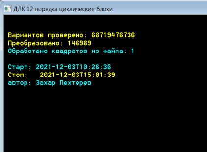 Решила попробовать преобразование цикличеÑких блоков в новом квадрозавре Ñ 30192 Д-транÑверÑалÑми 0 10 4 5 2 9 3 8 6 7 11 1 11 1 5 4 8 3 9 2 7 6 0 10 5 6 2 8 0 1 10 11 9 3 4 7 7 4 9 3 1 0 11 10 2 8 6 5 2 3 11 0 4 6 7 5 10 1 8 9 3 2 1 10 7 5 4 6 0 11 9 8 8 9 0 11 5 7 6 4 1 10 2 3 9 8 10 1 6 4 5 7 11 0 3 2 6 5 3 9 10 11 0 1 8 2 7 4 4 7 8 2 11 10 1 0 3 9 5 6 1 11 6 7 9 2 8 3 4 5 10 0 10 0 7 6 3 8 2 9 5 4 1 11 Программа Захара нашла в Ñтом ДЛК 36 уникальных цикличеÑких блоков. У Ð¼ÐµÐ½Ñ Ð±Ñ‹Ð»Ð¾ такое же количеÑтво цикличеÑких блоков в антиквадрозаврике Ñо 115 Д-транÑверÑалÑми. Программа работала больше 4 чаÑов. ЗапуÑтила программу, вычиÑÐ»ÐµÐ½Ð¸Ñ Ð½Ð°Ñ‡Ð°Ð»Ð¸ÑÑŒ. |